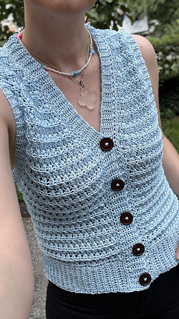 Il gilet Aria si lavora con righe di andata e ritorno dall’alto verso il basso. Inizialmente si lavora il dietro dello sprone, poi le spalle, poi il corpo in un pezzo unico. I bordi sono rifiniti con un punto a coste all’uncinetto.