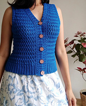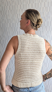 The Aria Waistcoat is worked from the top down in back and forth rows. First the back of the yoke is worked, then the shoulders, and finally the body. Edges are finished later in a ribbed crochet stitch.