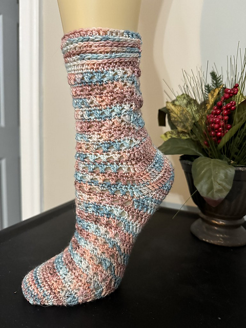 As the weather gets warmer here, I wanted to design a pair of crocheted socks that were soft and fluffy, but also airy. That can be complicated with a crocheted sock. The crossed stitches really give strength to these socks, but also create small holes for breathability.