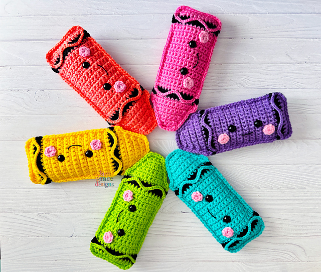 Our finished Mini Crayon project is 3.5” x 8” using the recommended hook size. You are welcome to go up or down a hook size to create a different dimension. You can even hold two pieces of yarn together with a larger hook to create a giant cuddler. The sky is the limit!