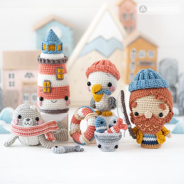 Lighthouse Island – the sea-themed set of toys from the ‘Mini Kingdom’ collection. This pattern describes how to create the following five toys: Lighthouse Keeper, Bucket of fish, Pelican, Lighthouse and Baby Seal.