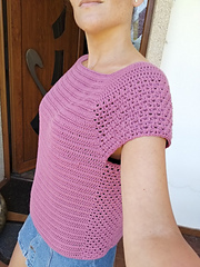 The Seimeira Top is a garment constructed in one piece and flat using back-and-forth rows. It is worked top-down and with a raglan yoke. It has a V-neck and a simple fantasy stitch on the sleeves and sides.