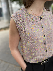 L’ Apostrophe Slipover présente un empiècement horizontal sur la partie haute du corps. Puis les mailles sont relevées pour tricoter ce gilet en jersey et en allers-retours et de haut en bas.