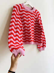 The sweater is worked with a classic raglan set-up top down in one piece. First of all, the yoke is worked in the wave-lace pattern in rows to shape the round neck. Afterwards, when the round neck is closed, the yoke is worked with raglan increases and in wave lace pattern in the round. When the sleeves are separated, the body is finished in one piece without any increases and a hem in 1x1 twisted ribbing in the MC. The sleeve stitches are now picked up again and the sleeves are worked until the desired length in wave lace pattern too. Shortly before the cuffs, a bunch of decreases is worked for a balloon-like sleeve shape. Then, the cuffs are worked in 1x1 twisted ribbing in the MC as well. Finally, stitches around the neckline are picked up in the MC and the double folded collar is worked in 1x1 twisted ribbing. The fit of the sweater is neutral to slightly oversized creating a comfortable fit due to the positive ease of 2 to 12 cm. The length is relatively short for a cropped look of the sweater. The most exciting thing is the wave lace pattern – consisting of garter stitch stripes alternating with lace pattern stripes creating the unique wave lace pattern, which is then emphasized by the two contrasting colors.