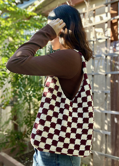 The crochet checkered tote bag is a fall classic. Start this new season off with this functional and fashionable accessory! Although more suitable for intermediate crocheters, beginners can also tackle this project with the help of the [video tutorial][1]. And if you prefer a smaller or larger bag, this pattern lets you know what you need to change!