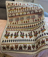 Pattern is written in English (US Terms). It has a Spanish, German and Dutch translation, and a left-handed version too. It has step-by-step written instructions, a mosaic tutorial and a border tutorial, charts, and lots of pictures to guide you through all the CAL parts.
