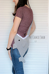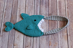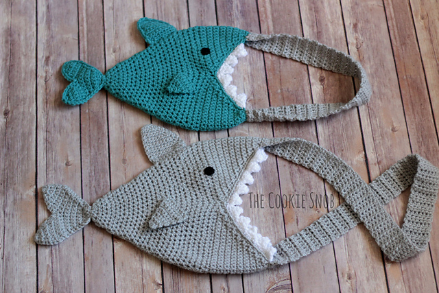 This shark bag pattern has both a child and an adult size option. Each is made with less than 1 skein of worsted weight yarn (I used Loops & Threads Impeccable for the child size and I Love This Yarn! for the adult size). You will also need a little bit of worsted weight yarn in black and white for the eyes and teeth. Everything is worked using a size I (5.5mm) crochet hook except for the eye on the child-sized pattern, which uses an H (5.0mm) crochet hook. But you can easily substitute different hooks since gauge isn't critical.