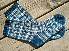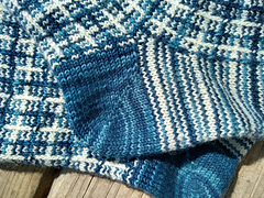 The stitch pattern uses two colors, and thanks to a few slipped stitches, only one color is used at a time. Twisted stitches emphasize the vertical elements, and occasional purls at color crossings echo a tartan's twill. It looks complex, but is actually easy to memorize and work. Stockinette stitch stripes provide a smooth and comfortable sole.
