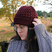 **October Road** hat is a unisex, visually-lush cabled beanie that gives the appearance of complexity, while remaining simple and attainable. Using simple 3x3, 2x2, and 1x1 cables, this beanie is the ideal first cabled hat project to get used to chart reading, cabling with or without a cable needle, working decreases, and practicing a tubular cast on.