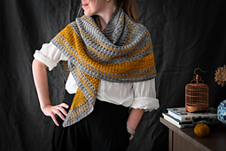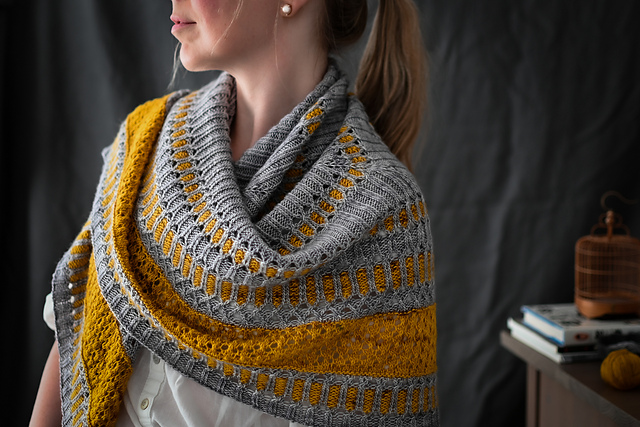 The shawl is inspired by the colours and textures reminiscent of the Shanghai lilongtangs (里弄堂) - traditional city dwelling complexes - in the onset of the autumn, when the golden ginkgo leaves pool at the street corners, creating a jarring contrast against the grey brick walls of laneway houses off the quieter city streets, hidden and secluded from the eyes of a regular passerby.