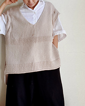 **Ulalaca** is a vest with two different length options - short or tunic in relaxed sizing. Knitting top down, begin from each front shoulder and form the V neck line of the collar with i-cord edge while knitting fisherman's rib cables on the sleeve side, and join the left and right pieces. The back body is knitted in the same way, and the front and back bodies are connected. For short vests, knit ribs for specified length, finish with the stockinette stitch and curl. The sleeve openings are picked up from the armholes and work in the same way.