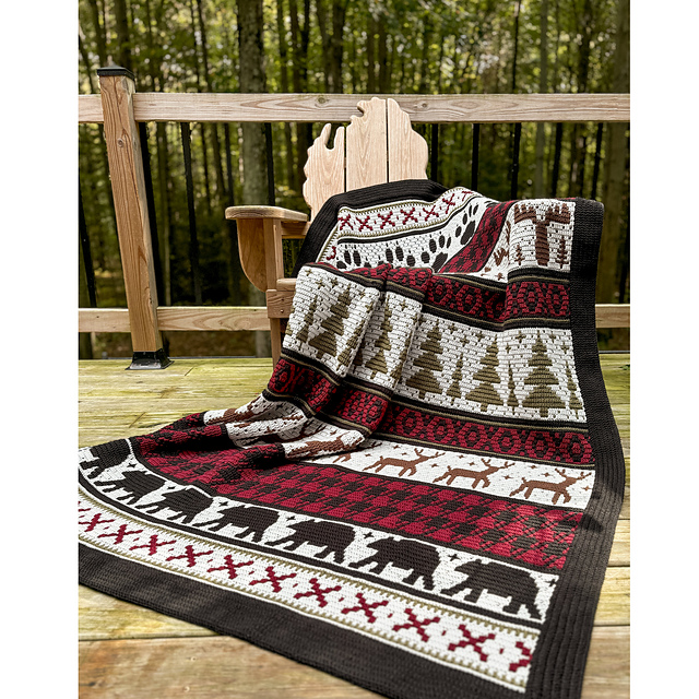The North Woods Afghan is made using the overlay mosaic crochet method. The great part about this method is it looks really complicated but is actually quite easy…and very addictive! You can achieve gorgeous colorways and beautiful patterns with mosaic crochet. You will crochet on only the right side of your work, and you will cut your yarn at the end of every row. When you’re done with the body of the blanket, you can choose to leave the multi-colored fringe that is created or work the double border like I have for clean, finished edges.