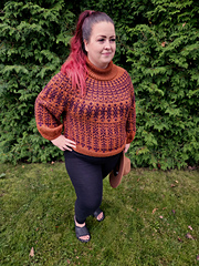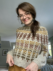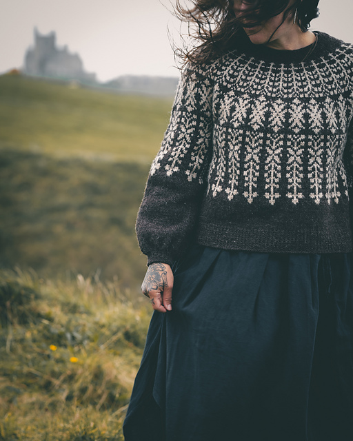 **OBSIDIAN** is a round yoke sweater with a top-down construction, relaxed boxy fit and colourwork on the yoke, body and sleeves. This pattern offers 2 options for the body and sleeve shaping: v1 with the A-line body and slightly exaggerated balloon sleeves and v2 with a straight body and balloon sleeves.