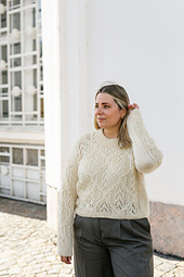 The Champagne pullover has a boxy fit and dropped shoulders. It is knitted seamlessly top-down with a cable and lace pattern on the front, back and the sleeves. The pullover is started at the back neck and increased to the full width of the back. The increases over the cable pattern are fully charted. Then stitches are picked up for the shoulders and worked as the front of the pullover. The front and back are joined at underarm and the body is then worked in the round. Stitches are then picked up from the body for the sleeves and the neckband. The sleeves have a bit of short-row shaping at the sleeve caps to improve the fit. The hem and cuffs are finished with a tubular bind off, which provides a beautiful and stretchy edge that looks like the stitches roll over the edge to the other side of the ribbing. The neckband is folded double in the end.