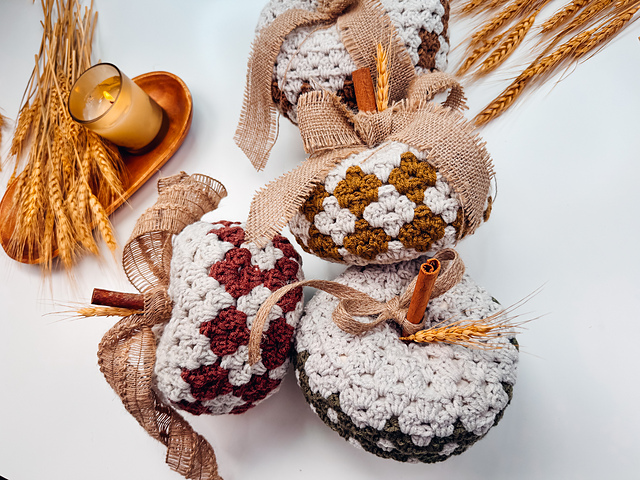 * **Charming Diamond Granny Stitch:** Choose between two different diamond granny stitch colorwork patterns to create a pumpkin that’s uniquely yours. The intricate stitch adds texture and depth, making this pumpkin a standout piece in your fall decor.