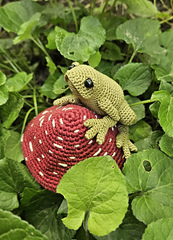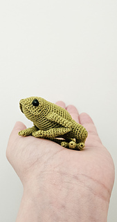 Pocket-sized frog is 8cm long, using laced weight yarn, 0.90mm with 6mm eyes.