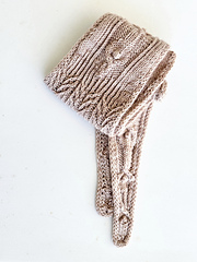 The highlight of this design is the interconnected cabled stitches, featuring a central bobble that evokes the look of a stylised flower or leaf. This feminine motif extends to the pointed edges on both sides, making the scarf a delicate yet functional accessory, ideal for gift knitting or personal wear.