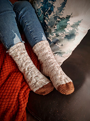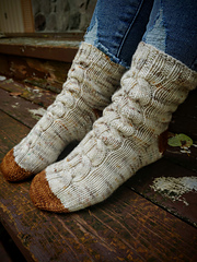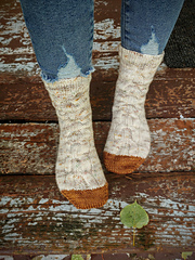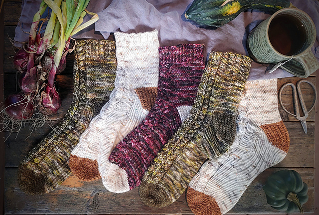 The pattern is a collection, of three DK weight cuff down socks, inspired by the Homestead. Each design is squishy, cozy, and fun! The techniques are adventurous beginner level and each design has been created to be easily remembered for an intuitive, engaging and rewarding knitting experience.