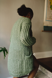 **YARN USED:** Hobbii Happy Place Apricity, super bulky weight (#6); 65% alpaca, 28% polyamide, 7% wool [131 yards per 50g skein]. Sample uses 11 (14, 17, 20) skeins in the color Sage (#20).