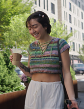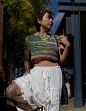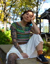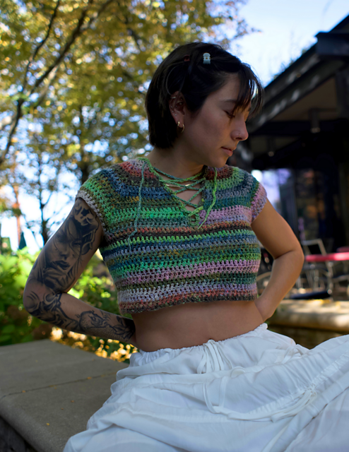 **Construction** - Garment is worked top-down to create yoke & v-neck shape, underarm chains are added before continuing onto the body section. Lastly, a simple border is worked onto neck opening, and a crochet chain is used for the center lacing.