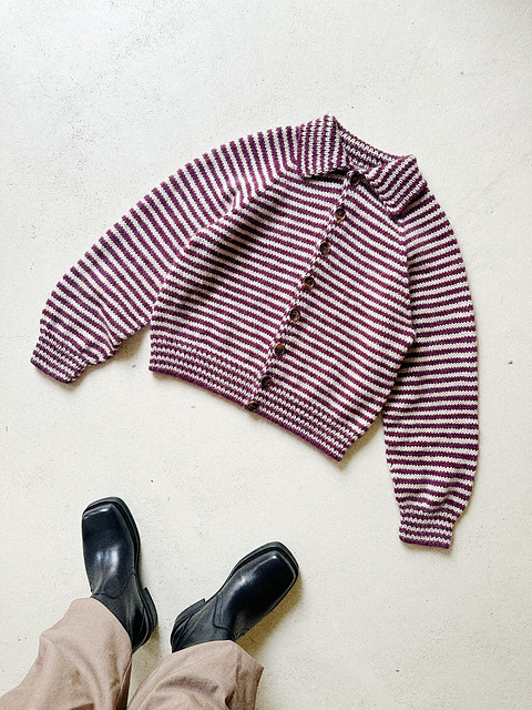 Stripe Overload Cardi is knitted from the top down, starting with the collar. To shape the neckline, short rows are used. The cardigan is knitted in a stripe pattern throughout.