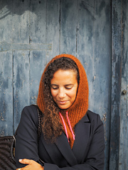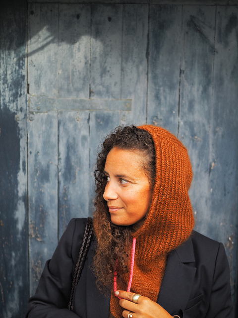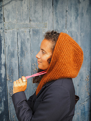 **YARN:** the hood is knitted with two strands of fingering and lace yarn held together.