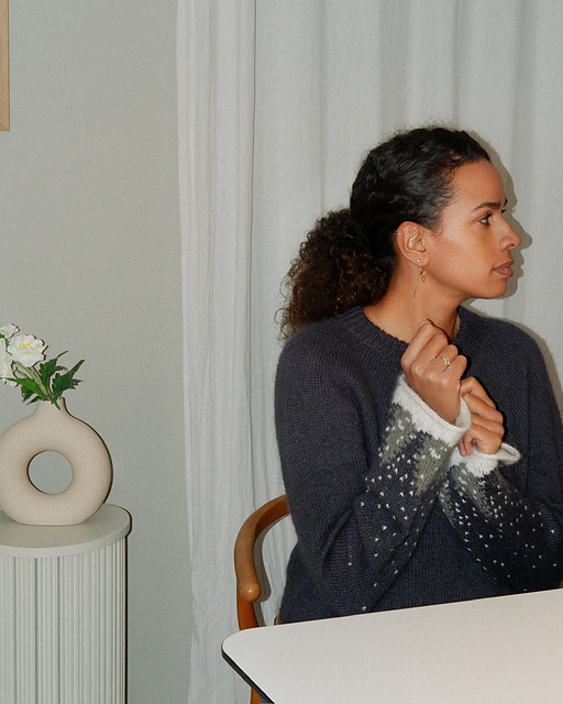 You begin with the folded ribbed neckband and continue with neckline shaping using German short rows. Afterwards, increases are worked around the yoke down to the underarms. After the yoke is finished, sleeve stitches are placed on hold to be worked after the body has been completed. The body is then further shaped by working additional German short rows at each underarm before you continue in the round to desired length and finish the body with a ribbed hem. The sleeves are worked from the bottom up, beginning with an i-cord edge and later following charts, and they are sewn to the yoke with grafting stitches. Lastly, the The Fair Isle pattern is charted only.