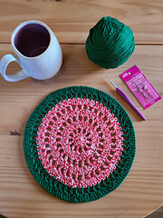 Plant fibers (like cotton) are best for this project if it will be used in the dining room. While it may be a bit tricky at first, using a small hook size (like the G referenced) will create a tight, even fabric that’s very durable.