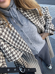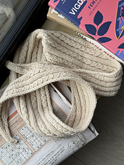 Thelma scarf er et pent lite skjerf som strikkes frem og tilbake i falsk flettestruktur og ribbestrikk med i-cordkanter. Skjerfet går rundt halsen to ganger.
