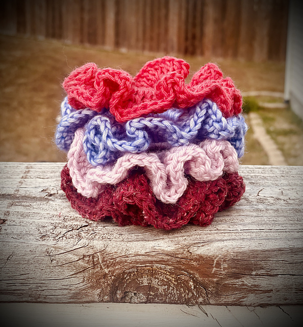 There is a section in my pattern called “possibilities” where you can explore all the options of this scrunchie. Definitely check that out before starting. My samples all stop after Rnd 2, but I encourage you to experiment and see what works for you. This is a beginner friendly pattern, it includes a photo tutorial at the end of the written instructions and uses basic stitches.