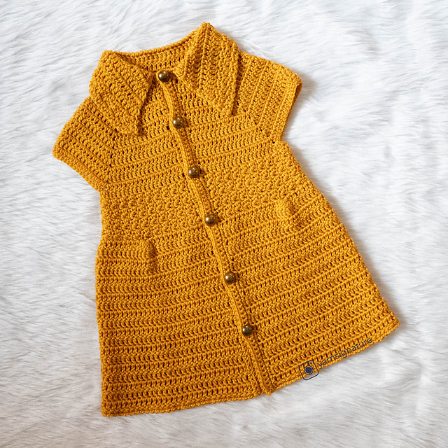 The Craspedia Shirt Dress features intricate crochet work with a mix of smooth stitches, giving the garment a refined texture and symbolizing good health and happiness. The structured design, including a collared neckline and button-up front, adds a polished touch to the detailed stitch work.