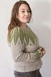 Greenleaf is a top down and seamless stranded yoke sweater featuring big, graphic leaves. Have fun choosing seasonally inspired yarn and colors or choose something more neutral for year-round wear. Options for short or long sleeves are given with choice of ribbed or colorwork sleeve cuffs. The chart for this design is particularly simple, great for those who are new to stranded knitting.