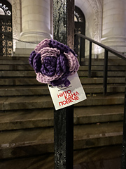 "Roses Against Violence" is an activist project designed to raise awareness about domestic and gender based violence. The initiative originated in Austria in 2018 and quickly spread worldwide. The concept is simple: crochet a purple rose and place it in a prominent public space in your community. This form of activism, known as "yarnbombing" uses knitting and crochet to make a political statement by drawing attention to this social issue.