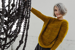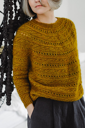 Inspired by autumn’s golden hues, Zelts (Latvian for “gold”) is a meticulously crocheted, textured sweater. Crafted bottom-up in the round, it joins the body and sleeves at a lowered bust line, flowing into an elongated circular yoke with delicate lines of leaves and filet crochet eyelets.