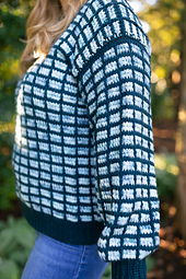 The Cozy Brick Sweater is size inclusive, bottom up, and the length is customizable to your preference.