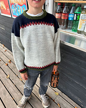 The Cross Sweater Junior is worked from the top down. A band of crosses is worked on the yoke and along the bottom of the sleeves and the body. First, the top part of the back yoke is worked back and forth, then each shoulder is worked back and forth on a circular needle. Both shoulders are then joined to form the front yoke. The front and back yoke are joined at the underarms to form the body, which is worked in the round on a circular needle. The sleeves are worked down from stitches that are picked up and knitted around the armholes. At the end, a folded neck edge is worked with stripes from stitches that are picked up and knitted along the neckline.