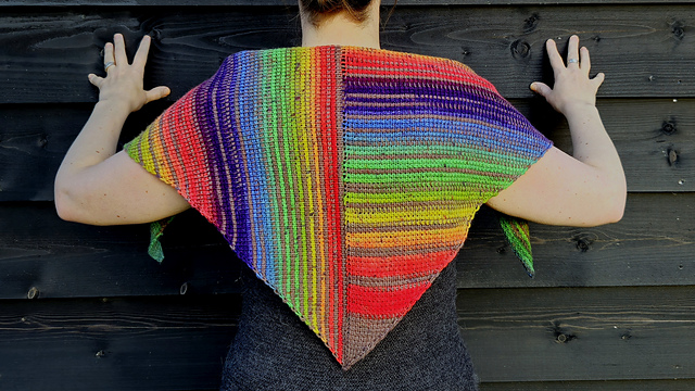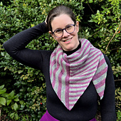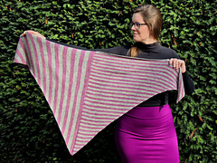 The *shawlette* requires 420 meters/459 yards per 100 grams or 2x 210 meters/230 yards per 50 grams of fingering weight yarn that’s dyed to create a perfect pair of socks with a striping or gradient effect.