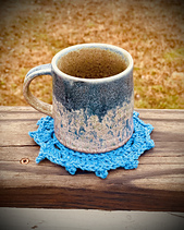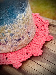 This pattern is made in worsted weight yarn with a 4.5mm hook. I think a synthetic or plant fiber is best for a coaster, as you will want it to be easy care. This coaster is worked in the round in dc st. You work increases every rnd to get it to the proper size and the last round adds a festive edging that is fun to make. Gauge is not crucial in such a small piece.