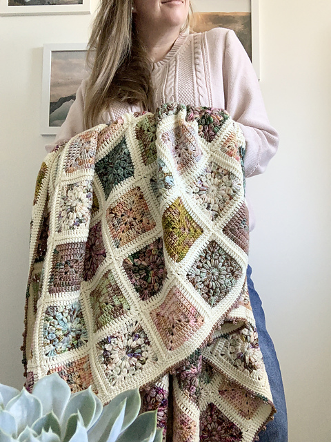 Pattern uses Succulents Yarn Subscription (2025), 12 skeins of (230yds/100g) with 5 skeins (230yds/100g) to join and a 4.5mm (size 7) hook.