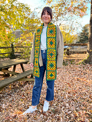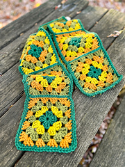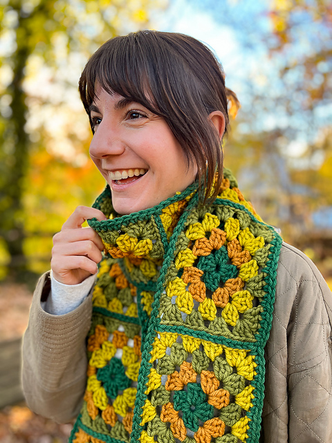 We're falling into fall with a chunky granny square scarf crocheted in our [non-superwash 100% Corriedale wool yarn, Cardo][1]. The Retro Cardo Scarf uses 4 colors of Cardo (in one skein apiece!): Bottle (dark green), Gecko (light green), Spirulina (acid yellow), and Goldenrod (golden yellow).
