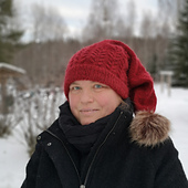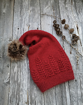 The hat has a double folded rib started with a Turkish cast on and joined with a Three Needle Join technique. Alternatively there are also instructions for a normal folded rib. The beautiful fern motif is knitted with cables and lifted stitches. A pom pom is fastened to the top of the hat.