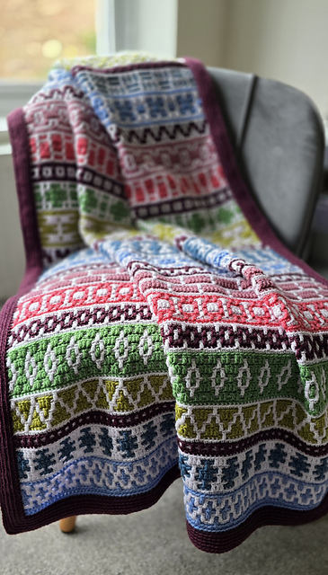 The 24-stitch repeat also makes Adventures in Overlay Mosaic easy to combine with many of my other mosaic crochet designs, including Lakenham Mosaic Sampler, Meow!, Woof!, March Hare, Flora’s Fauna and Letitia’s Garden (just make sure you start with a multiple of 48 + 6 chains to be sure that all designs will fit properly).