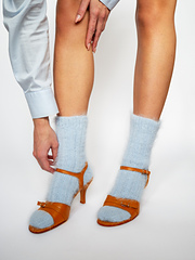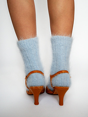 videre med dobbel ribbestrikk (2 r, 2 vr). Det økes masker i mønsteret for å forme hælen, deretter
