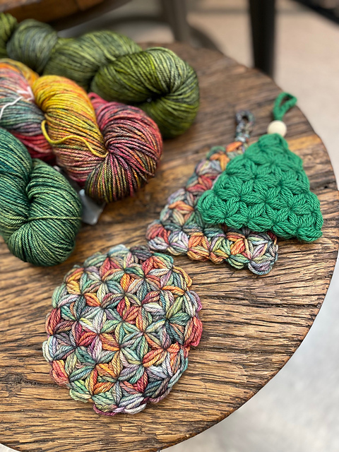 All of my samples are made using Malabrigo Rios, which is 100% sw merino wool. You can use any yarn for the tree, however, for the coaster I recommend a natural fiber. You don't want synthetic fibers in something that could get very hot because it could melt.