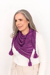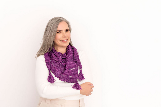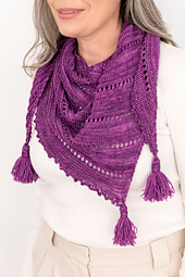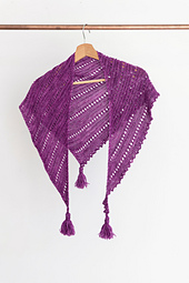 The Elfish Shawl invokes a playful spirit of self-care amid the joy of giving. This asymmetrical triangle shawl features bands undemanding garter stitch broken up by pretty eyelet rows to keep your needles dancing merrily along, and is finished with cheeky tassels to add a touch of whimsy.
