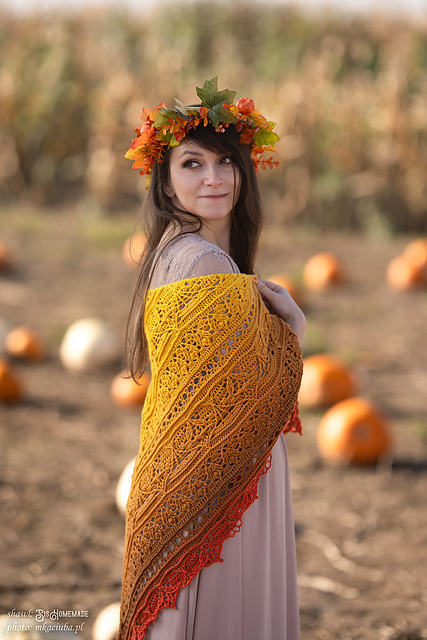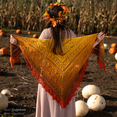 Chusta ze zdjęcia głównego została wykonana z włóczki firmy Kokonki (50% akryl / 50% merino) - Merino (rudy, ciepły brąz, miodowy, kurkuma, intensywny żółty) – 1400 m, 4 nitki ≈ 370 g, szydełkiem 3, 75mm. Wymiary chusty po blokowaniu to około 210/80 cm.