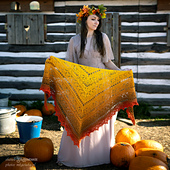 The shawl from the main photo was made of Kokonki yarn (50% acrylic / 50% merino) - Merino (ginger, warm brown, honey, turmeric, intense yellow) – 1400 m, 4 ply ≈ 370 g, crochet hook size 3.75mm. The measurement of the shawl after blocking are about 210/80 cm.
