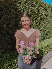 *Inspired by Victorian balls and whimsical gardens, this top is a romantic and feminine crochet garment that will flatter everybody! This romantic top is crocheted in two pieces and then seamed. The sleeves are crocheted directly onto the top. There is an option for button up or tie back closure.*