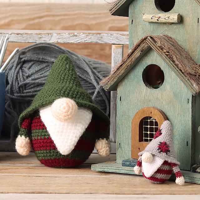 + Using hook size E/4 (3.5 mm) and worsted yarn the Beginner Gnome measures approx. 5.5 inches (14 cm) tall.