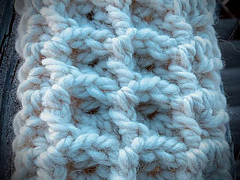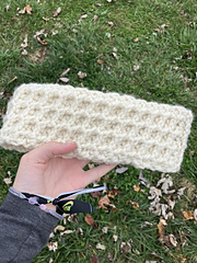 This pattern is made in super bulky weight yarn with a 8mm hook. I recommend choosing a natural or synthetic fiber—not something plant based as that won’t be as warm. This earwarmer is worked flat in the crochet waffle stitch (using half double crochet). You work it flat from bottom up and then seam the ends together.